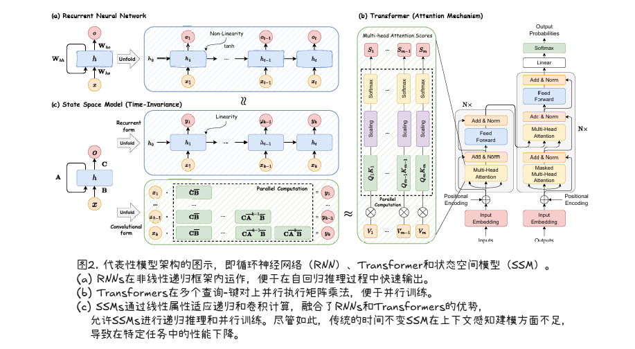 图2描述了循环神经网络(RNN)、Transformer和状态空间模型(SSM)的计算算法。